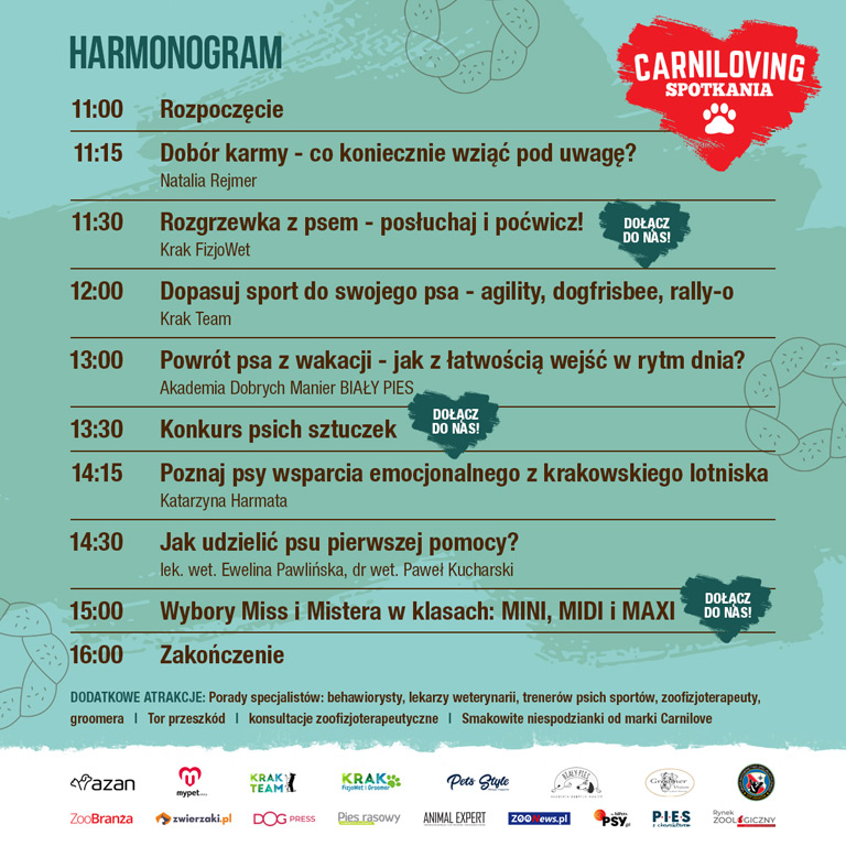 To oczywiście tylko niektóre z dostępnych atrakcji! Jak zawsze na wszystkich gości będą czekały smakowite niespodzianki od marki Carnilove, producenta wysokiej jakości przysmaków i karm dla czworonożnych ulubieńców. Nie zabraknie również atrakcyjnych nagród, które wpadną w łapki zwycięzców konkursów!