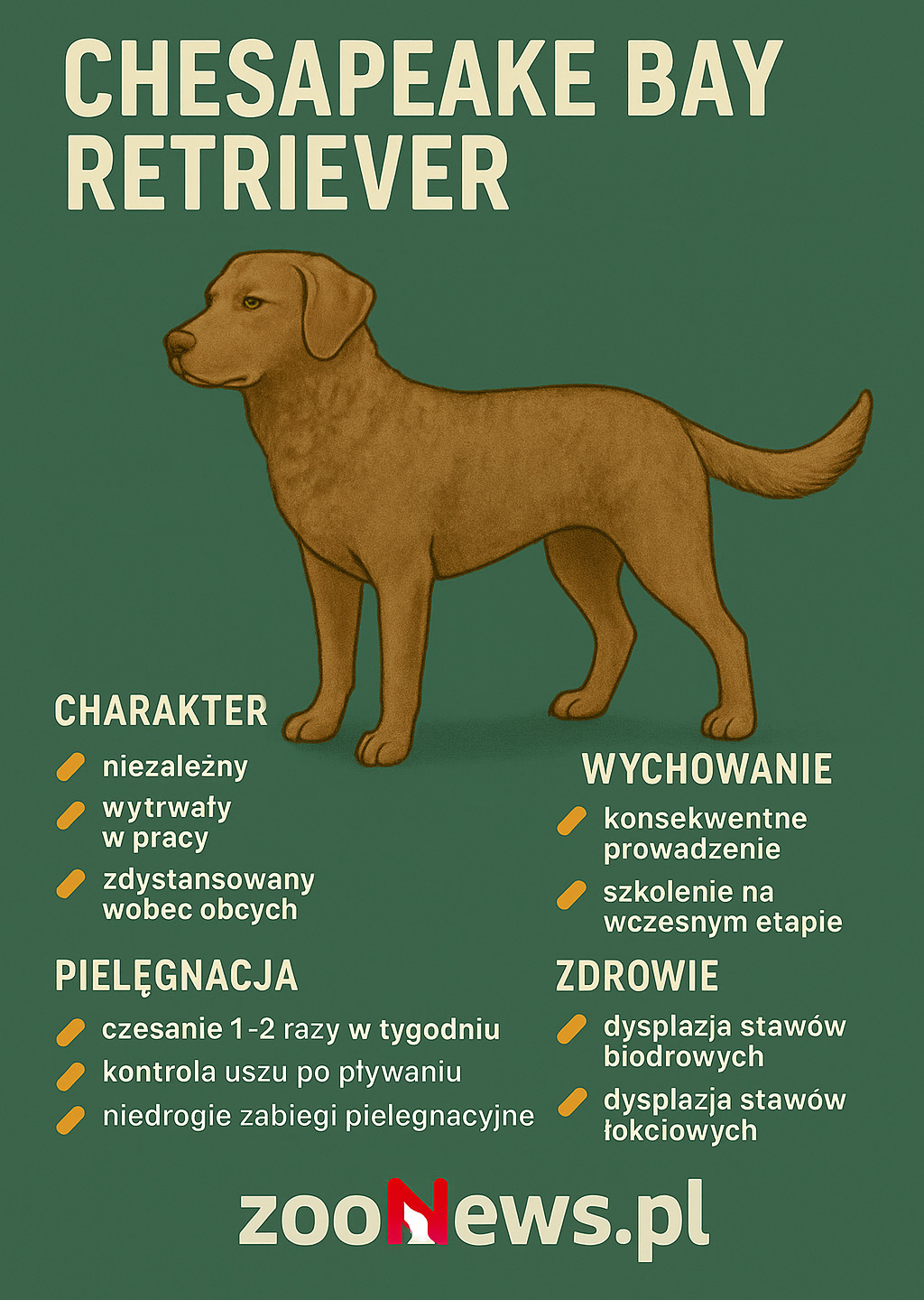 Chesapeake bay retriever to jedna z tych ras, które rzadko spotyka się na miejskich chodnikach, a zdecydowanie częściej wśród aktywnych opiekunów, którzy potrafią docenić siłę, wytrzymałość i ogromne serce tego psa do pracy. Choć na pierwszy rzut oka może wydawać się po prostu kolejnym „retrieverem”, ten pies ma w sobie wyjątkową niezależność i zaskakującą wytrwałość. To czworonóg, który doskonale wie, czego chce, a jeśli opiekun nie ma na niego pomysłu, chętnie sam obierze własną drogę działania. Dlatego właśnie nie każdy zdaje sobie sprawę, że bez codziennej aktywności, jasnych zasad i zaangażowania, nawet ten pozornie przyjazny pies może zacząć działać na własną łapę.