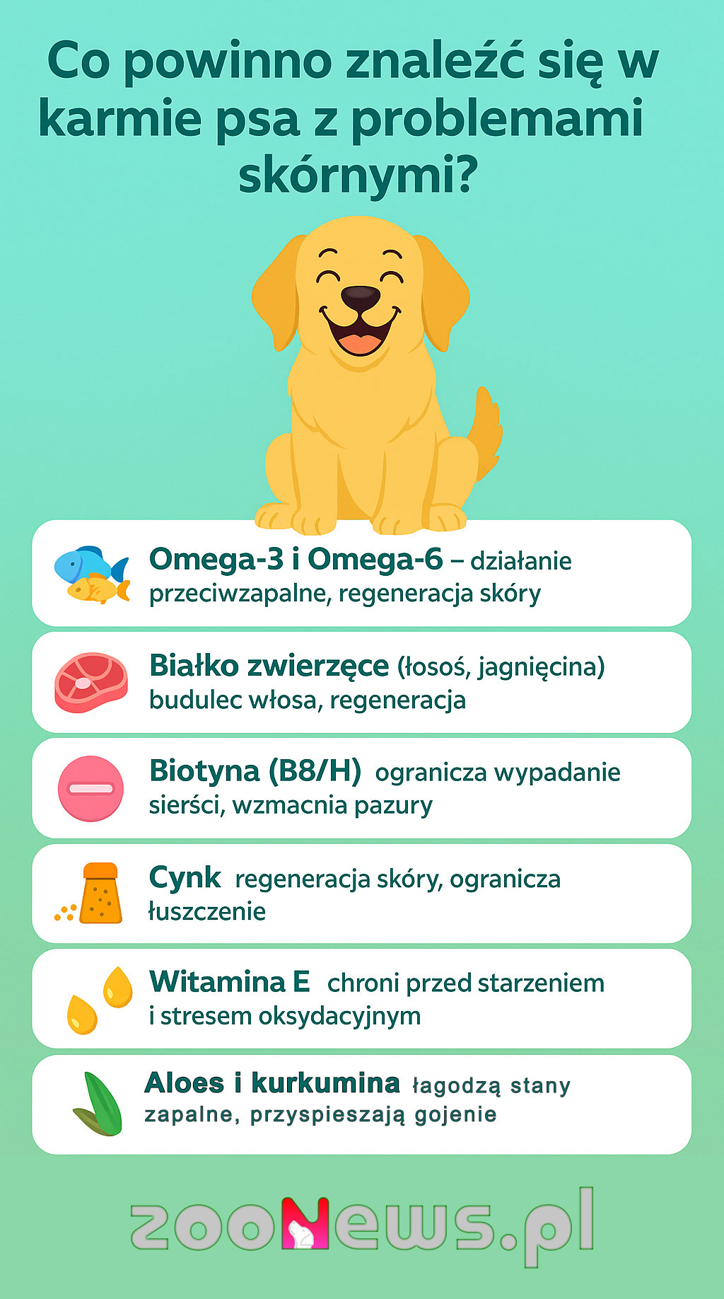 Najlepiej sprawdzają się kwasy tłuszczowe omega-3 i omega-6, cynk, biotyna oraz wysokiej jakości białko z ryb (np. łososia). Dobrze, jeśli karma zawiera też oleje roślinne i jest wolna od sztucznych konserwantów.